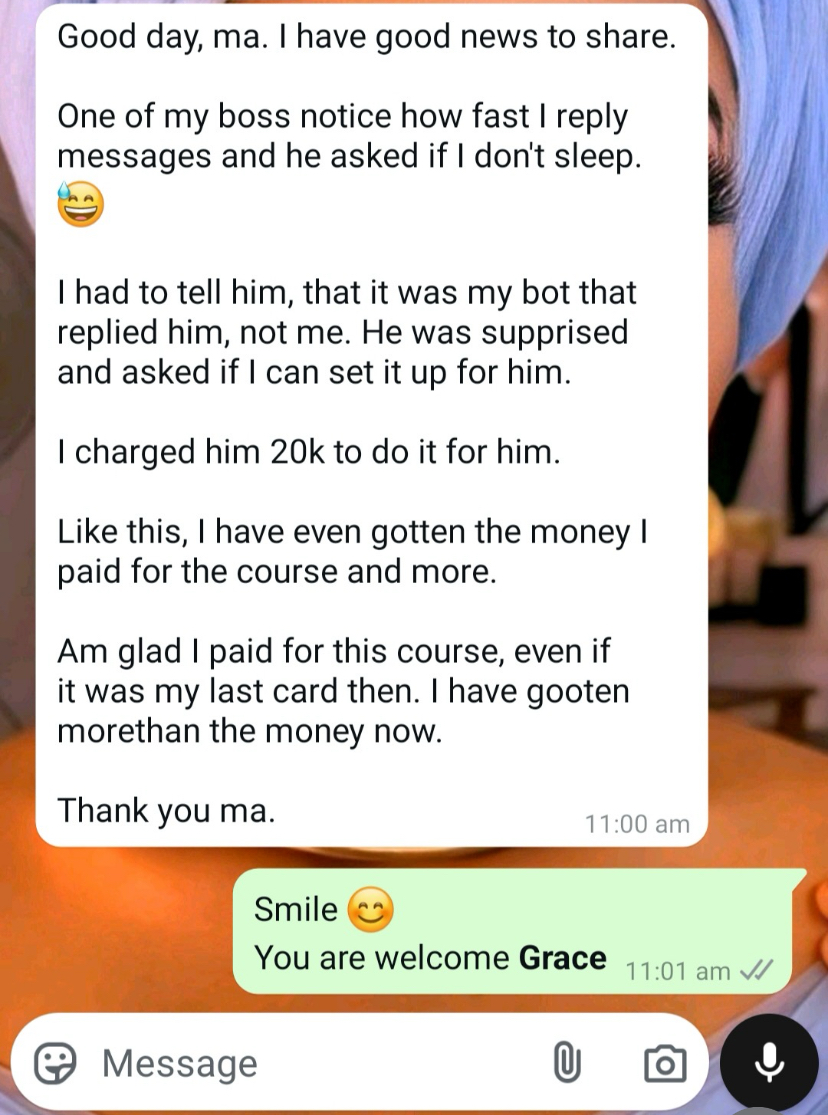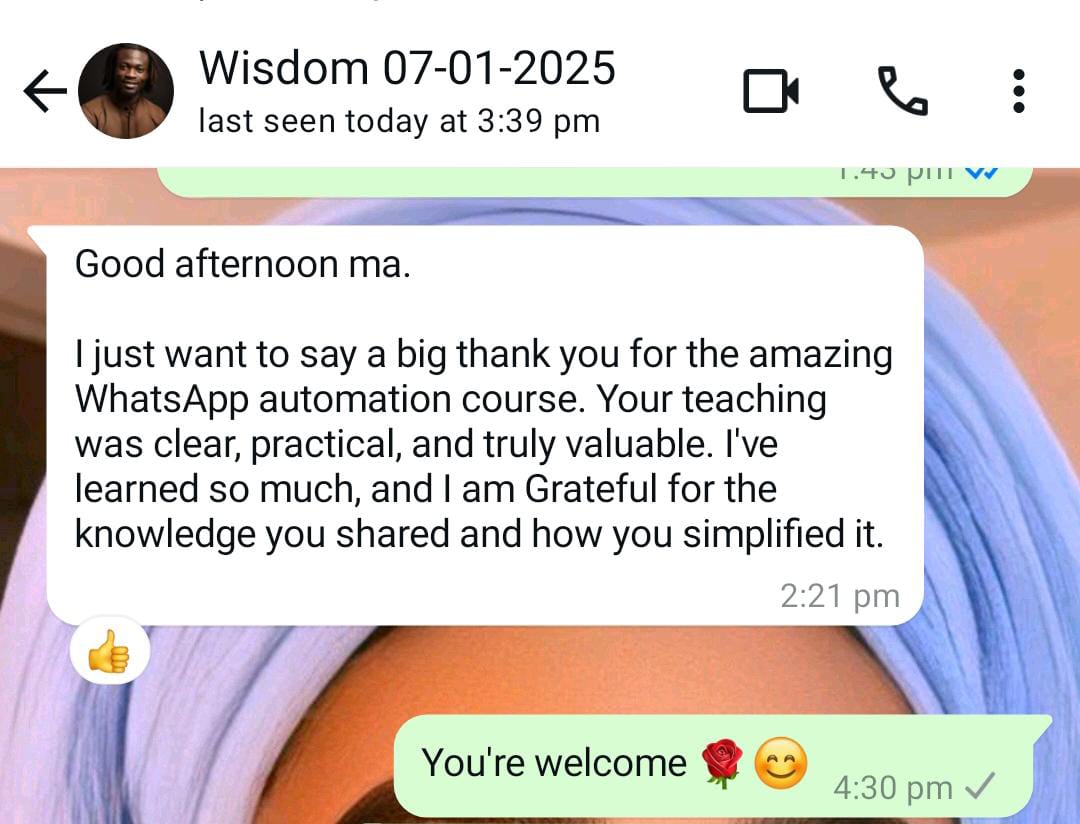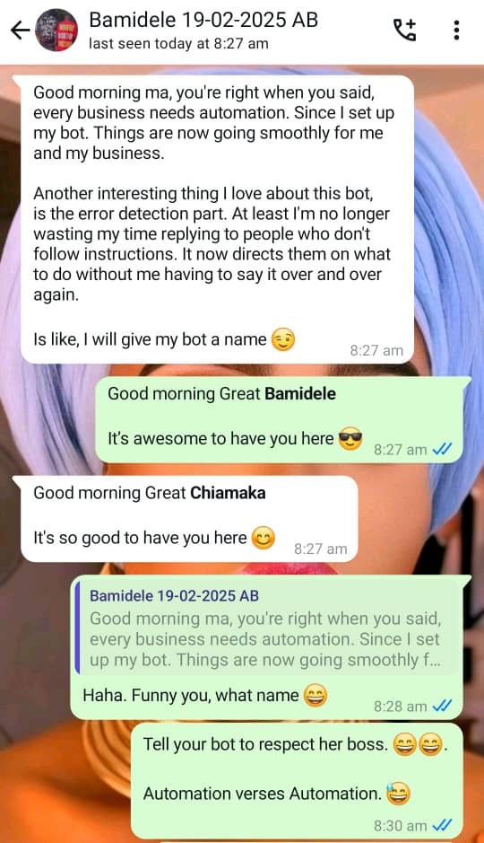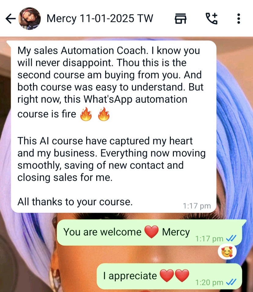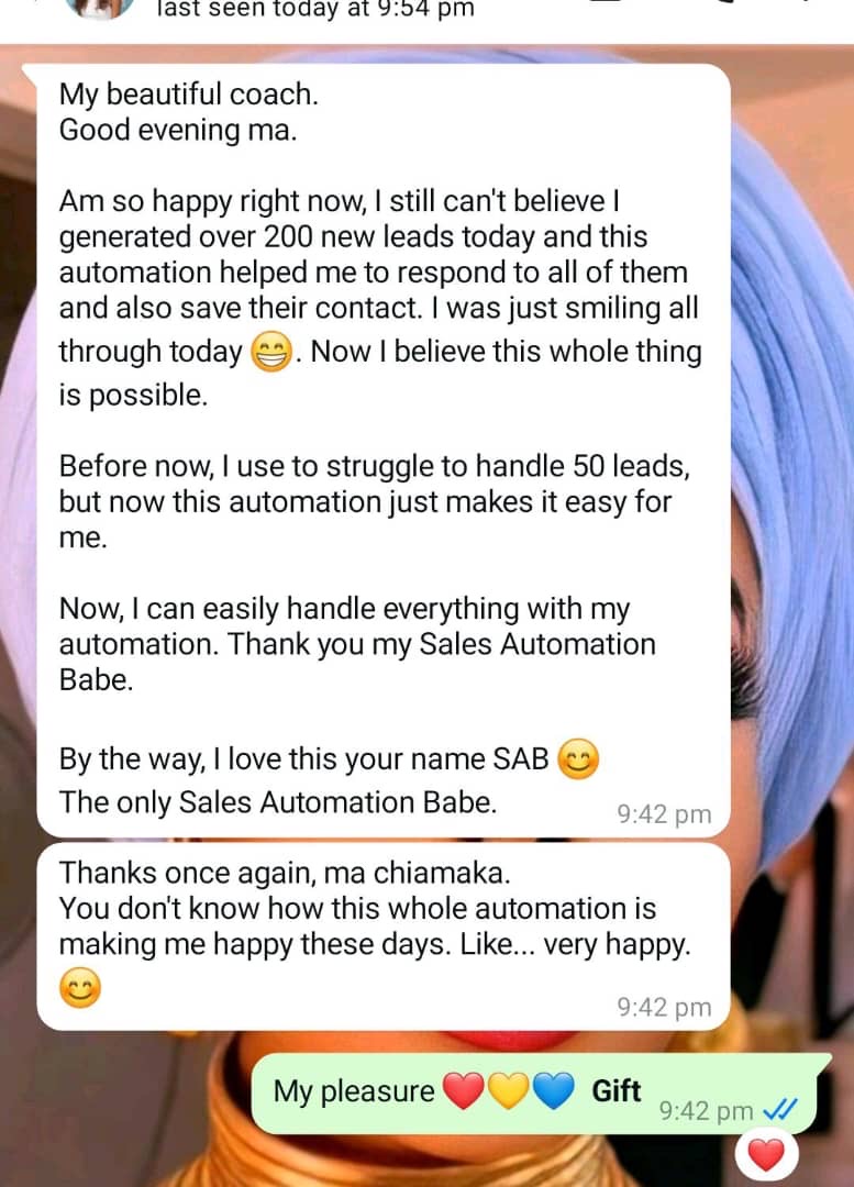 My drive to simplify the sales process led me to master WhatsApp Automation, enabling businesses to set up systems that close sales seamlesslyβeven while they sleep. Thatβs how the name “Sales Automation Babe” came about.