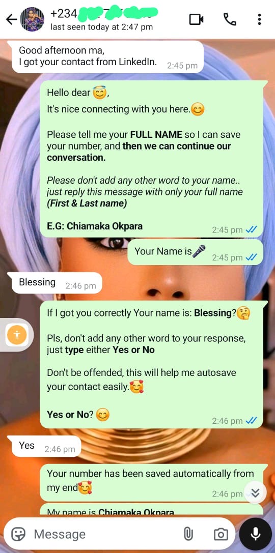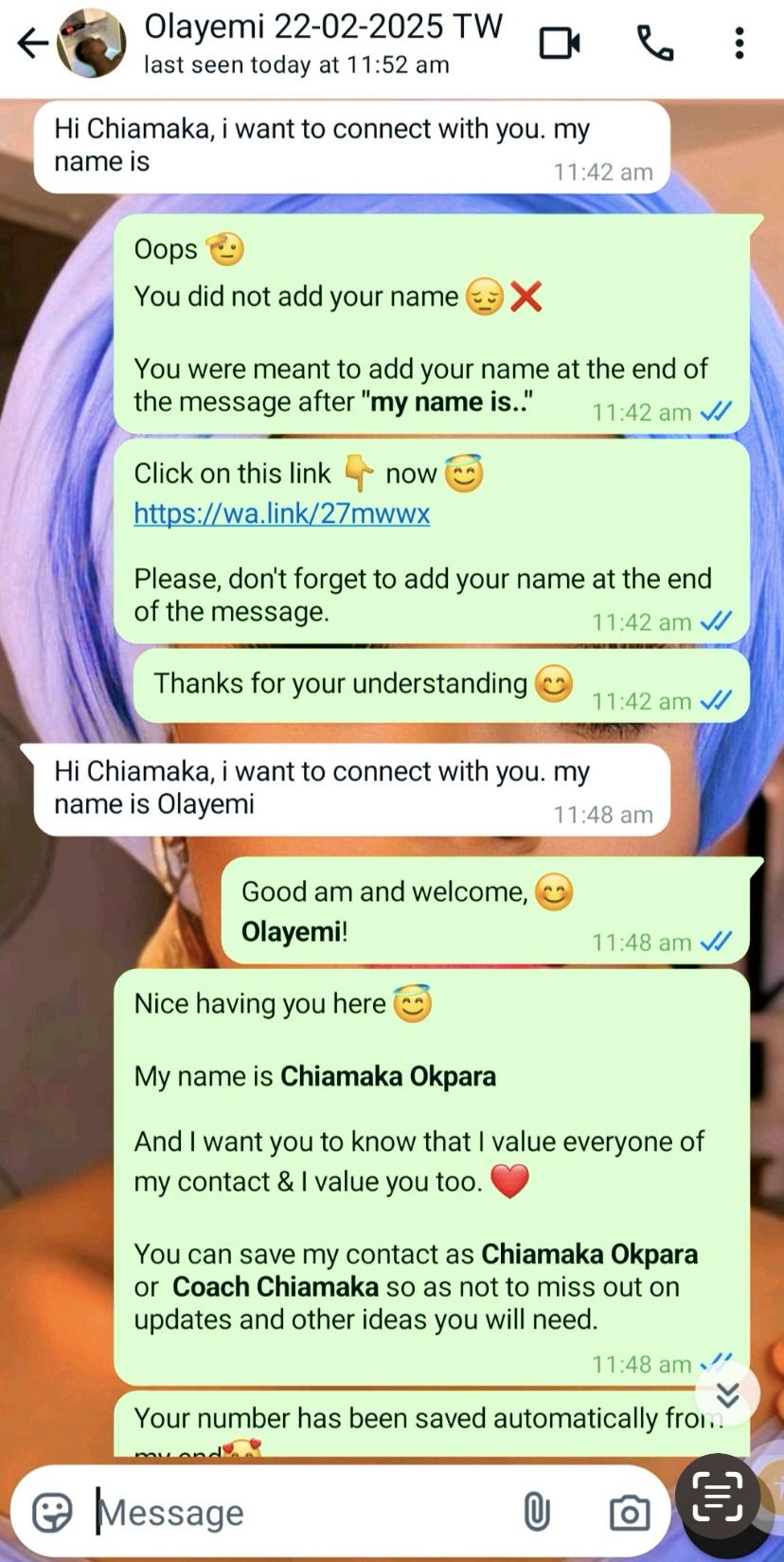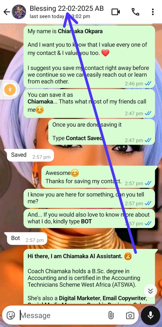 In this case, the client forgot to add his name, so the AI prompted him to do so. Once he did, it saved his name as ‘Olayemi,’ along with the date his number was saved and the suffix (TW), which I assigned for leads from that source.